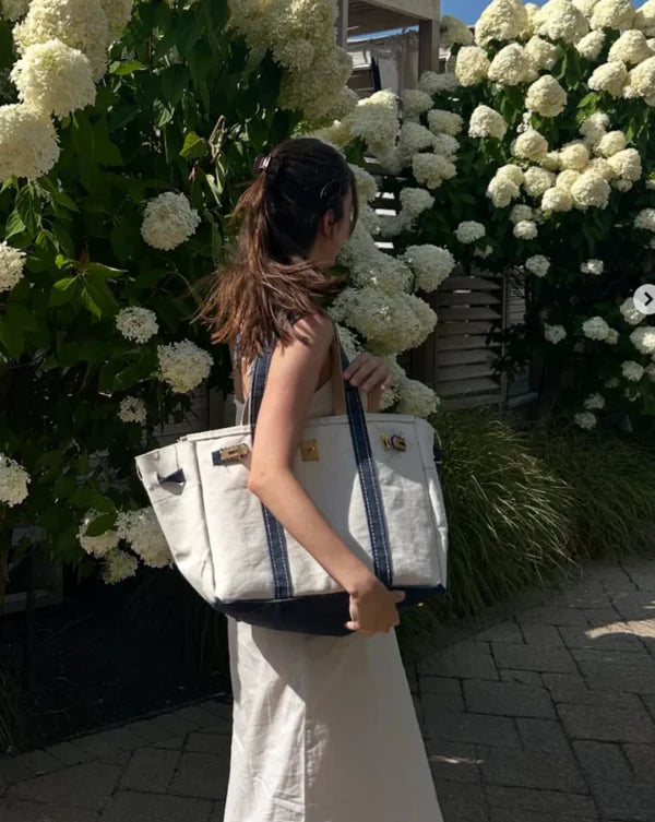 Découvrez le savoir-faire de près : toile de lineman robuste, coutures renforcées et quincaillerie en laiton massif — un tote qui ne vous laissera jamais tomber.